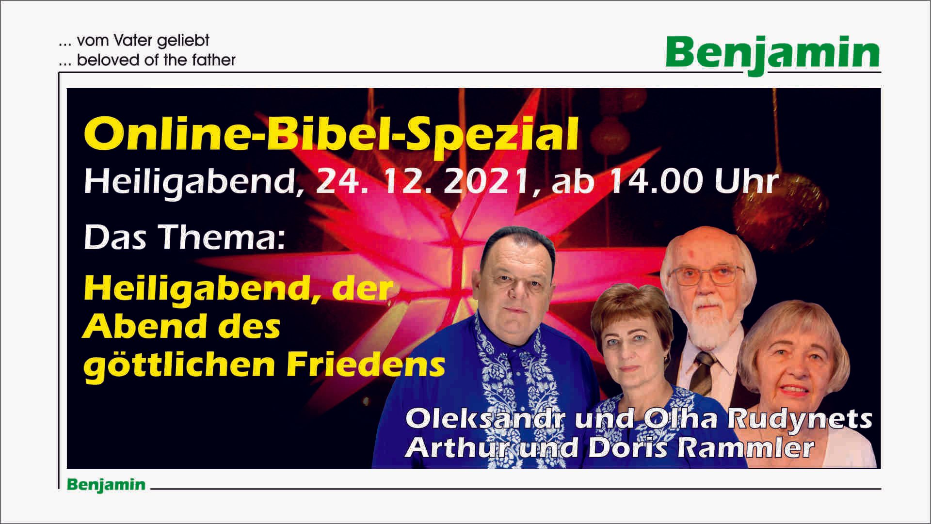 Am Heiligabend haben wir wieder unser Bibel Spezial. Neben den Sonntagsgottesdiensten werden wir auch einen besonderen Gottesdienst am Heiligabend haben. Dieser wird am 24.12. ab 14.00 Uhr auf unserer Webseite und auf allen unseren Social Media Kanälen abrufbar sein. Dieser Heiligabend Gottesdienst steht unter dem Thema: „Heiligabend, der Abend des göttlichen Friedens“