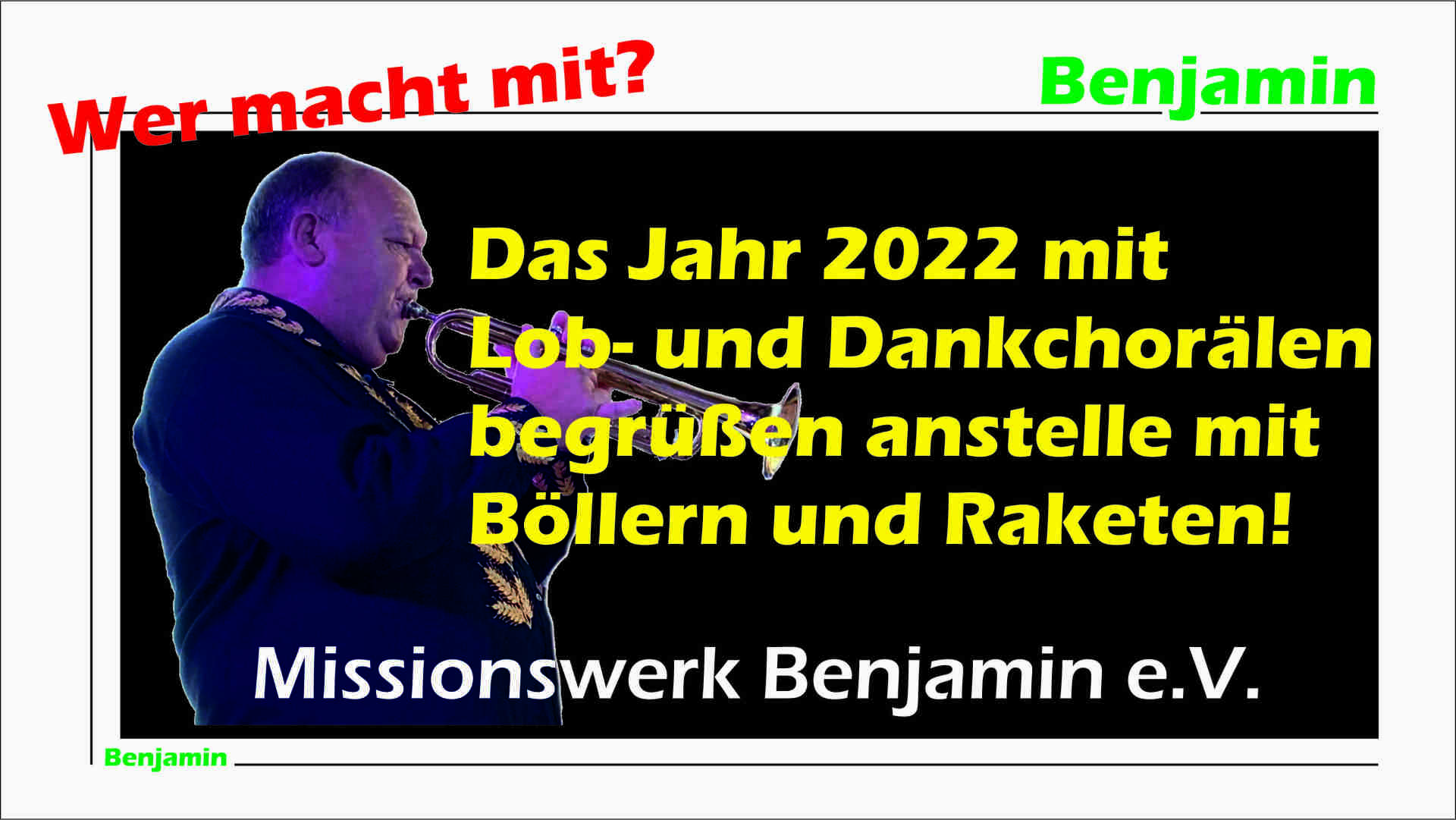 Den Silvesterabend möchten wir, wie bereits im letzten Jahr gehabt, wieder unter das Thema stellen: Lob- und Dankchoräle anstelle von Böllern und Raketen.
